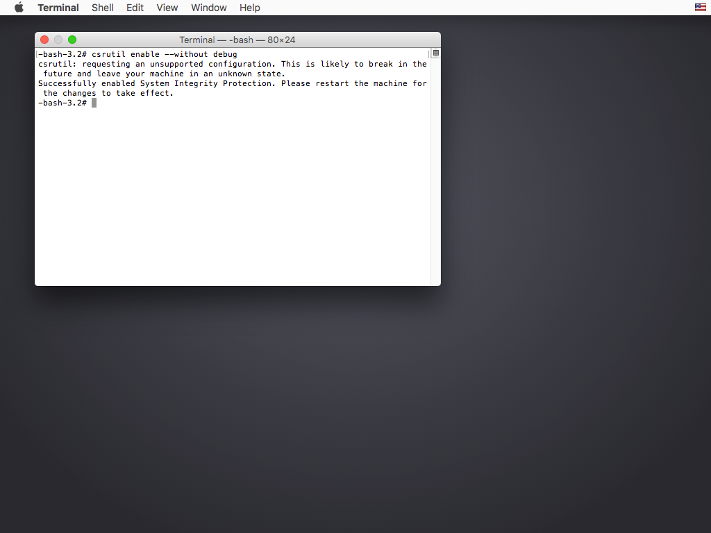 and press return. This turns off the part of System Integrity Protection that TotalSpaces2 needs to run, and OSX complains that it is an unsupported configuration.