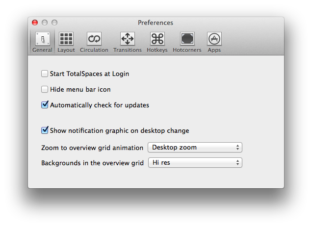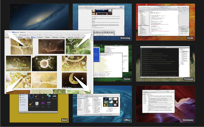 TotalSpaces2 allows you to bring up an overview of all the desktops in your main grid by triggering a configurable hotkey or by triggering a hot corner. The overview is an excellent way to manage your windows and desktops.