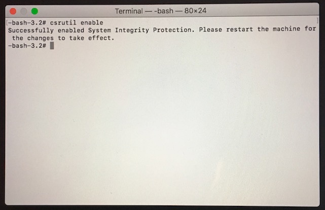 and press return. This turns on System Integrity Protection so your machine is fully protected.