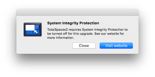 TotalSpaces2 requires temporary changes to your security settings to be upgraded. Read more about the settings here.